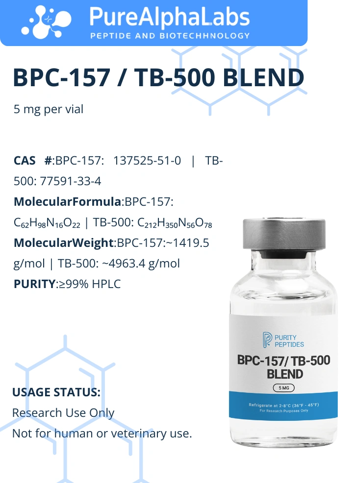 BPC-157 / TB-500 Blend is a synthetic peptide combination composed of Body Protection Compound-157 (BPC-157) and Thymosin Beta-4 fragment (TB-500). This blend has been extensively studied for its role in cellular signaling pathways related to tissue integrity, angiogenesis, and connective tissue organization. Unlike receptor-specific peptides, BPC-157 and TB-500 primarily influence intracellular and extracellular repair mechanisms rather than endocrine or hormonal systems.